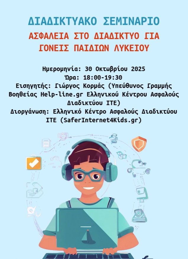 Με ιδιαίτερη χαρά σας προσκαλούμε στο διαδικτυακό σεμινάριο “Ασφάλεια στο διαδίκτυο για γονείς παιδιών Γυμνασίου και Λυκείου” την Πέμπτη 30 Οκτωβρίου 2025 και ώρα 18:00-19:30, που διοργανώνεται από το Ελληνικό Κέντρο Ασφαλούς Διαδικτύου ΙΤΕ (SaferInternet4Kids) με εισηγητή τον κ. Γιώργο Κορμά, υπεύθυνο Γραμμής Βοηθείας Help-Line.gr του Ελληνικού Κέντρου Ασφαλούς Διαδικτύου ΙΤΕ.