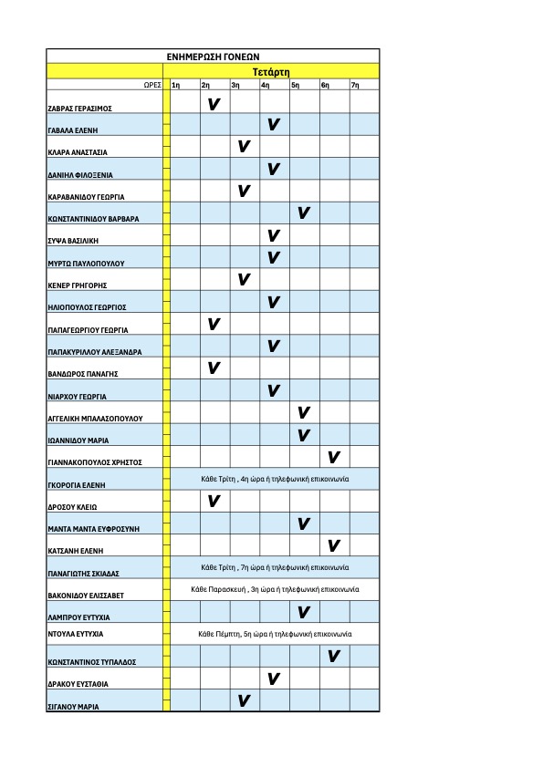 Κάθε Τετάρτη οι γονείς/κηδεμόνες μπορούν να ενημερωθούν είτε δια ζώσης είτε τηλεφωνικά από τους/τις εκπαιδευτικούς του σχολείου μας για την πρόοδο των μαθητών/μαθητριών μας σύμφωνα με το ακόλουθο πρόγραμμα ωρών: